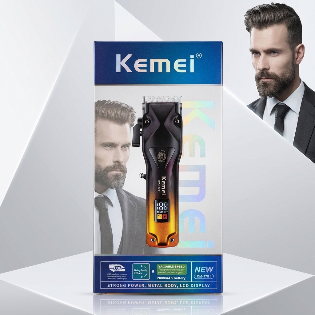 Kemei KM-1781 Professional Hair Clipper Delivers powerful, precision cuts every time:Key Features: All-metal body, LCD power display, 2000mAh battery.Benefits: Powerful motor for smooth trimming, long 220-minute cordless runtime, adjustable speed for versatile styling.Suitable For: Professional Barbers, Home Stylists, All Hair Types.