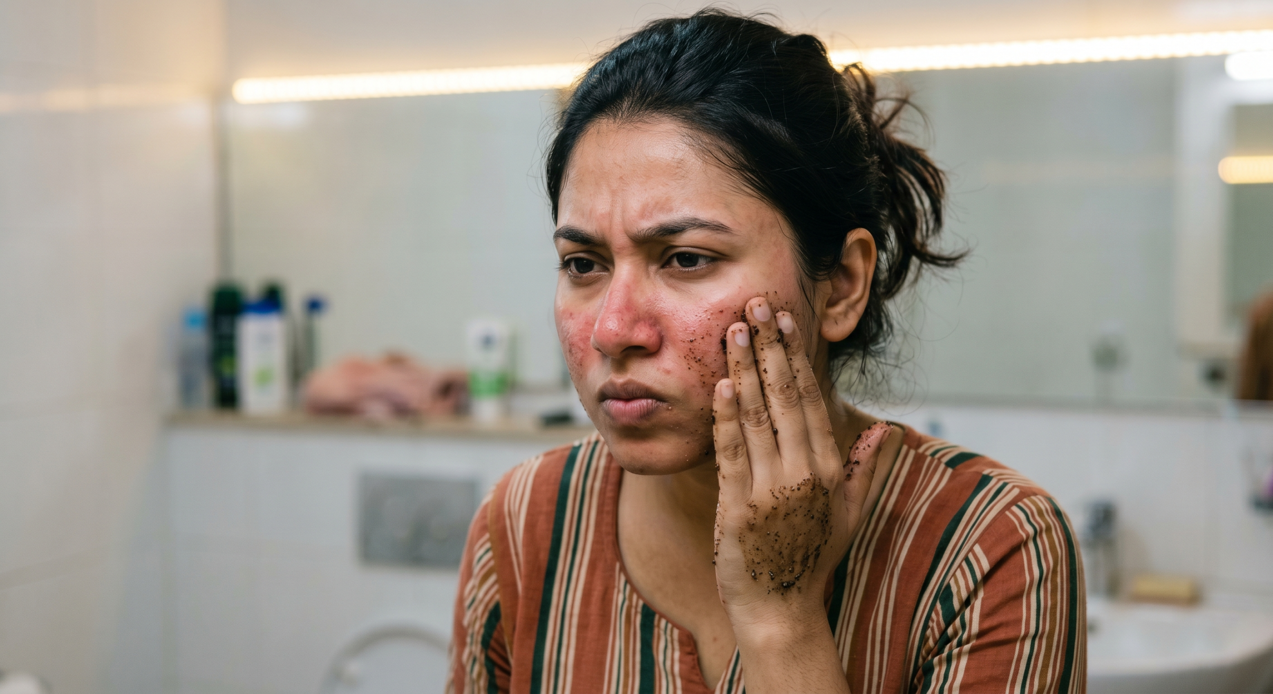We have a strong cultural reliance on vigorous scrubbing. From traditional ubtans mixed at home to thick commercial scrubs, the belief is that you must use physical friction to deeply clean the pores, remove tan, and reveal bright skin.